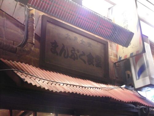 さらに少し移動しまして、ガード下の雰囲気ある食堂へ。 まんぷく食堂。昭和っぽさを演出したレトロな店内で、昼から景気よく飲まれるみなさんで賑わっています。 スタートから人数を少しずつ減らしてこの時点で6名。床に固定された椅子が少し窮屈ですが、6…